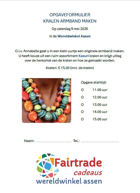 Ter gelegenheid van de Fairtradeweek 2026, dit is de week van 4-17 mei 2026, organiseren we een kralenworkshop. Deze kralenworkshop vindt plaats op zaterdag 9 mei in onze winkel en is onder leiding van Annabelle, van wie we diverse kralen in de winkel hebben. U kunt kiezen uit meerdere starttijden en per keer duurt het een uur. De kosten zijn € 15,- (inclusief de kralen) per keer. U heeft keuze uit een ruim assortiment Kazuri kralen en u krijgt uitleg over de herkomst van de kralen en hoe ze gemaakt worden.